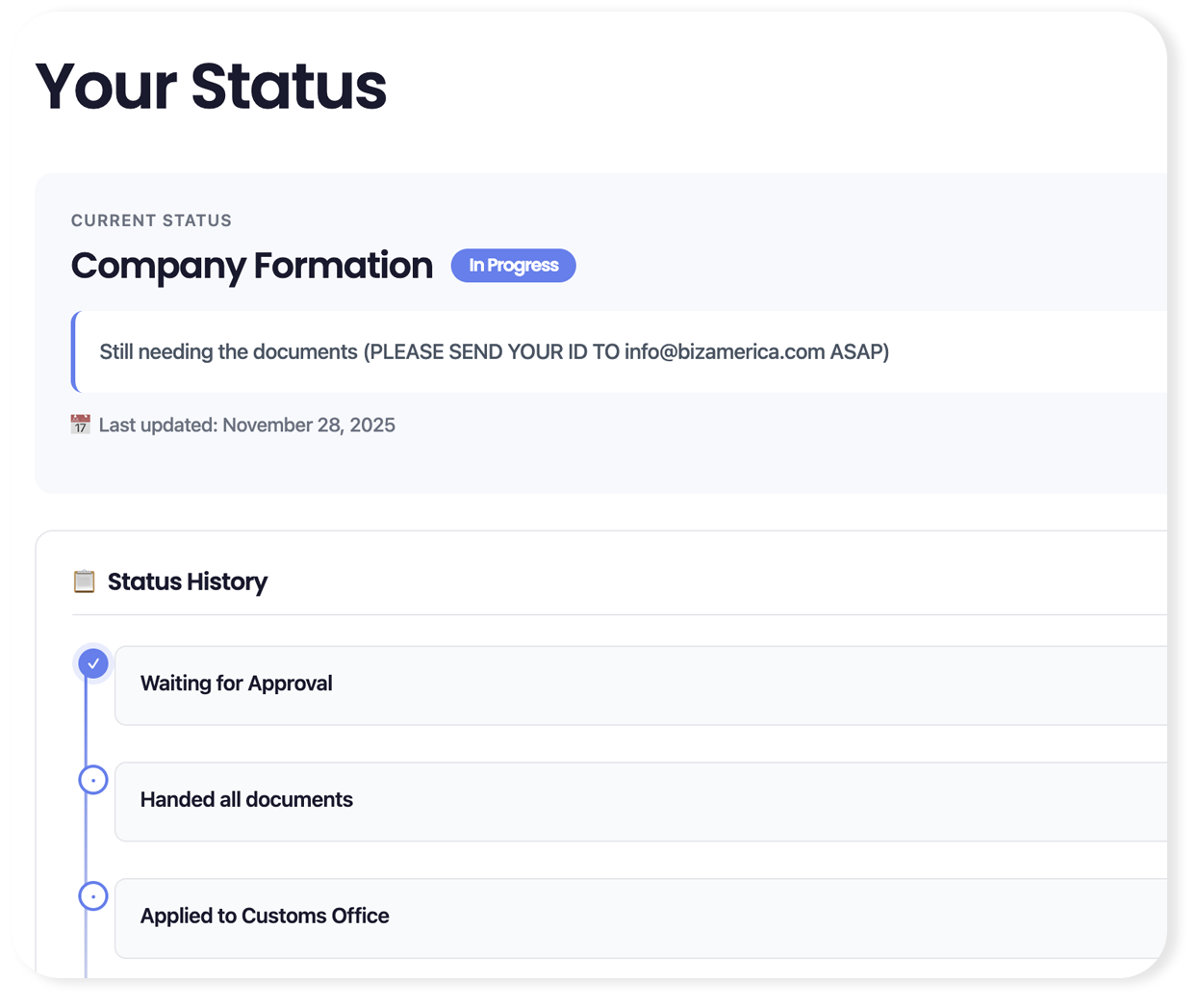 The BizAmerica Client Portal gives you a single, secure place to manage your company formation, documents, and compliance — in real time.